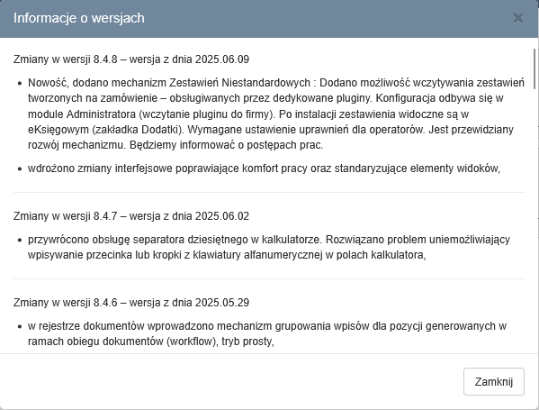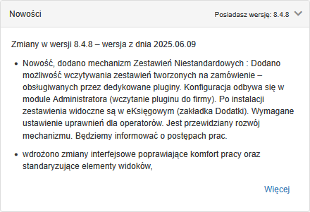 Po kliknięciu na przycisk "Więcej" pojawia się okno z opisem zmian w kliku ostatnich wersjach