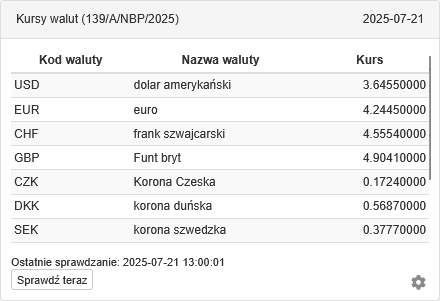 - kursy walut - informuje o aktualnych kursach walut oraz kiedy była ich ostatnia aktualizacja
