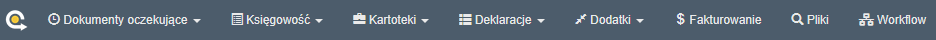 W lewej części górnego paska znajduje się rozwijalne menu, dzięki któremu można przejść do różnych modułów systemu eKsięgowy.
