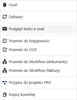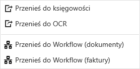 W przypadku przeniesienia dokumentów do księgowości można wybrać "Przenieś do księgowości" lub "Przenieś do OCR". Wybranie drugiej opcji spowoduje dodanie dokumentów do kolejki OCR i wstępne rozpoznanie dokumentu.
