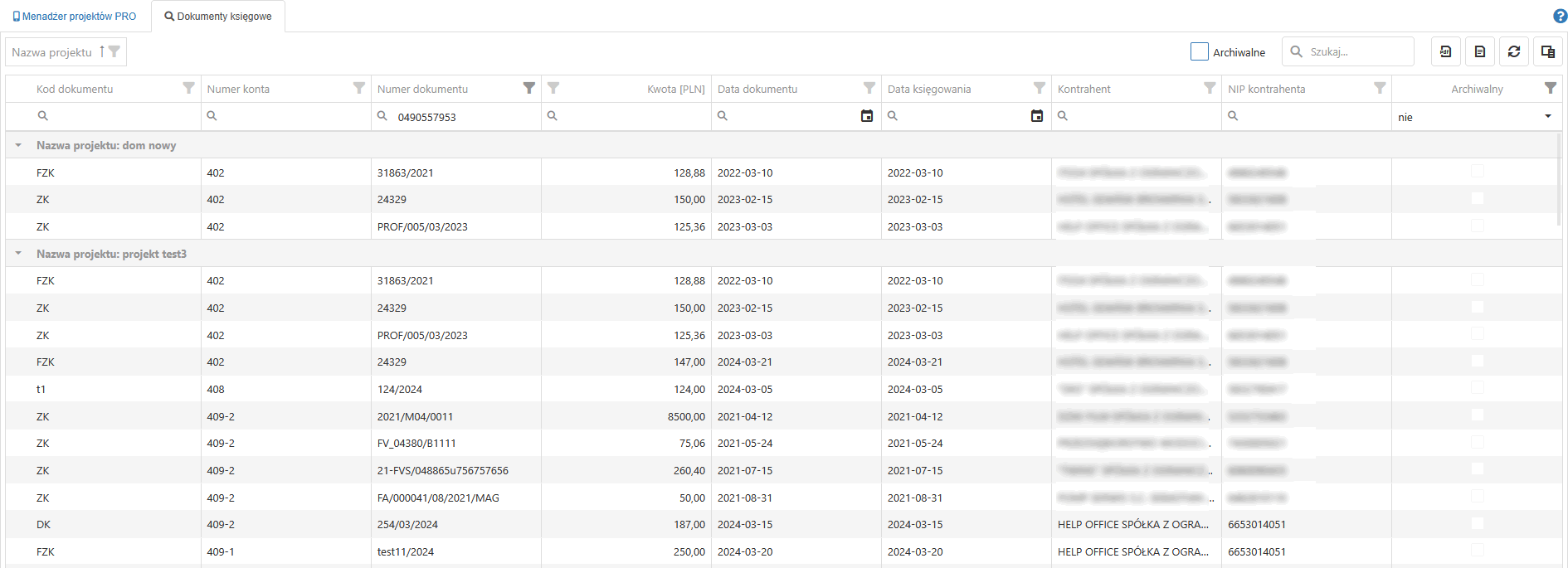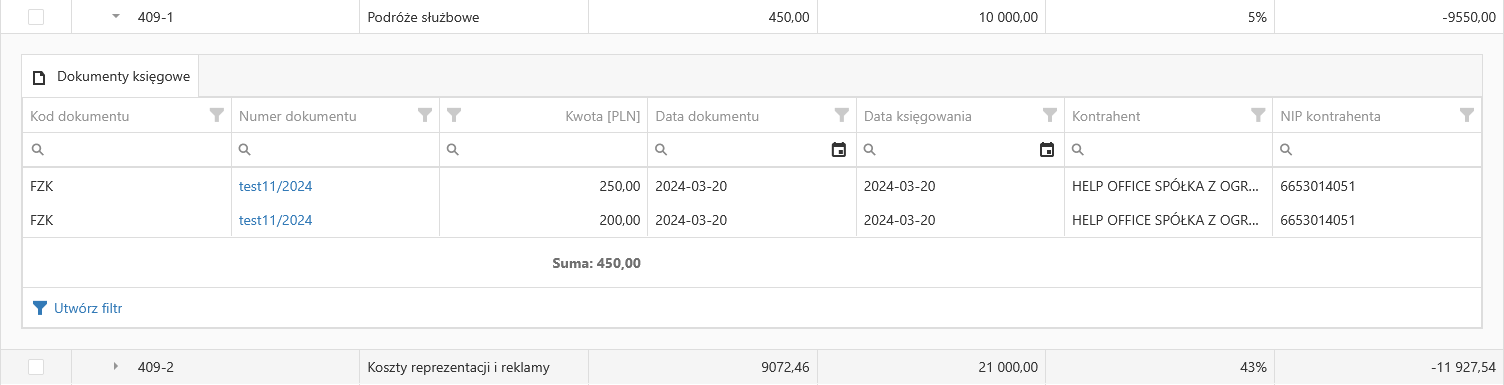 - Zakładka "Dokumenty księgowe"