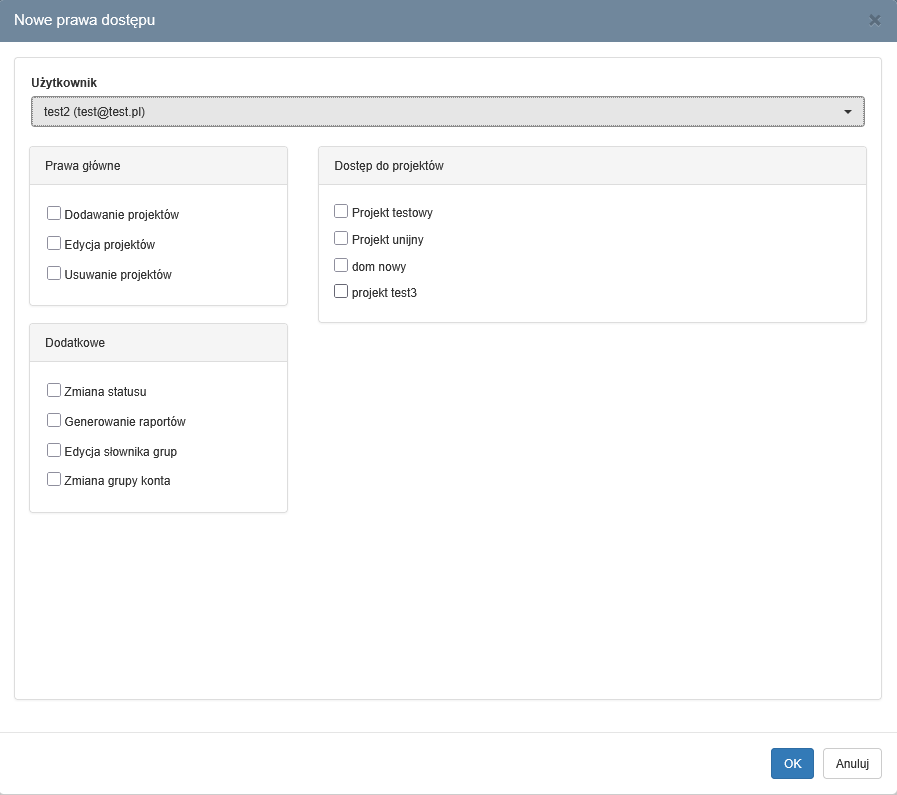 Przy dodawaniu praw użytkownikowi można określić do których projektów będzie miał on dostęp, czy może dodawać, edytować, usuwać projekt, a także bardziej szczegółowe prawa np. zmiana statusu, generowanie raportów.