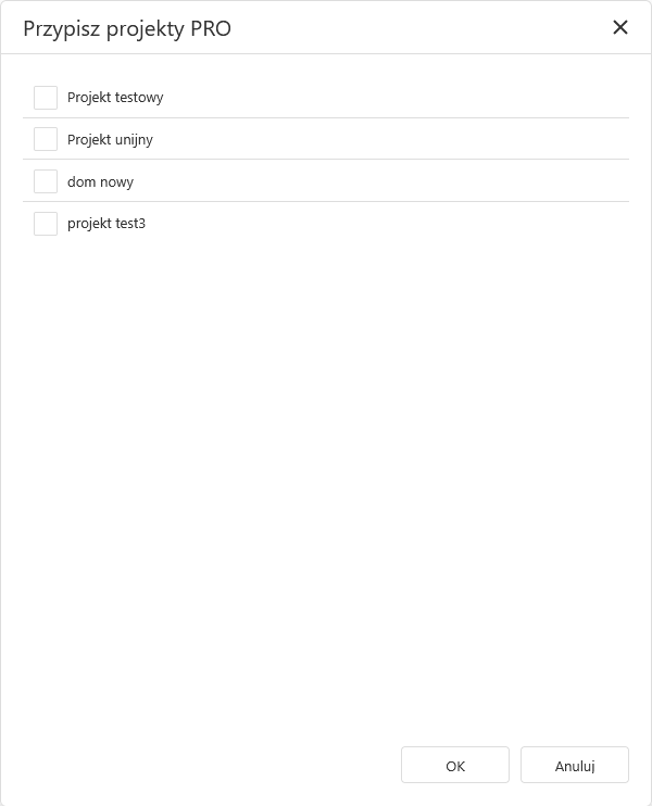 W nowym oknie należy zaznaczyć projekty które mają zostać przypisane