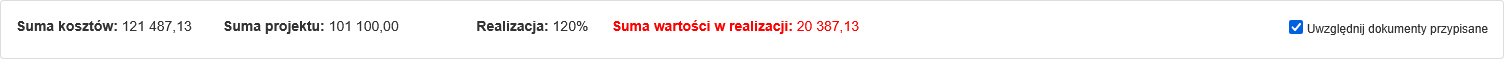 Zaznaczenie opcji "Uwzględnij dokumenty przypisane" spowoduje uwzględnienie w podsumowaniu dokumentów które są przypisane w eksięgowym do danego projektu ale nie zostały jeszcze zaksięgowane w programie finansowo-księgowym.
