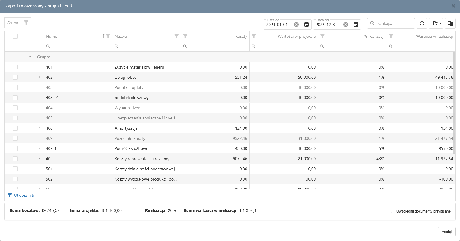 można wygenerować raport dla danego projektu.Na raporcie są ujęte konta które są przypisane do projektu. Kolumna "Koszty" prezentuje sumę zaksięgowanych dokumentów na danym koncie