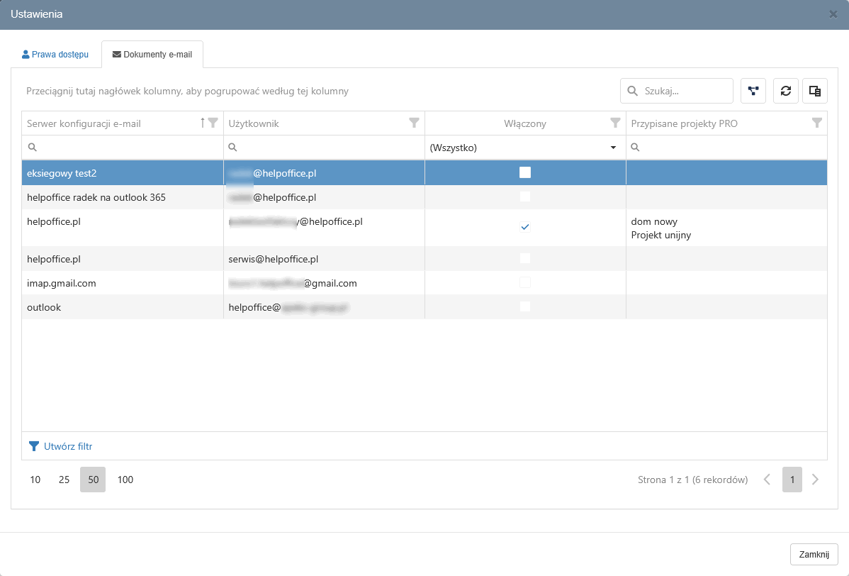 Zakładka "Dokumenty z email" pozwala przypisać konto mailowe z którego wchodzące dokumenty będą automatycznie dodawane do projektu.