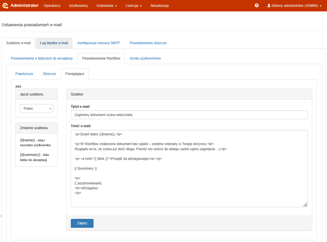 Dodatkowo w "Powiadomieniach workflow" można ustawić szablon dla wiadomości e-mail przypominających o przetrzymywaniu dokumentu e-mail na stanowisku.