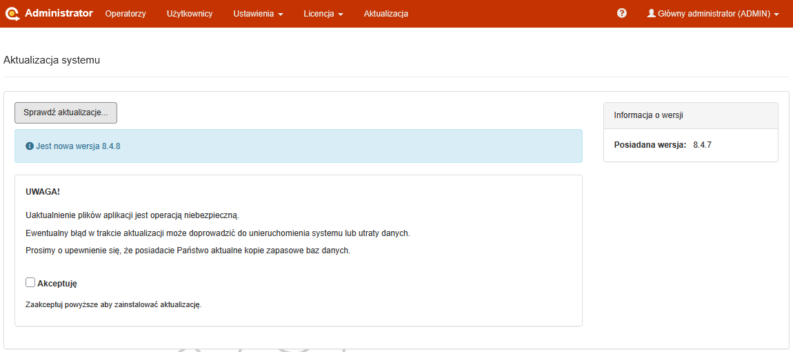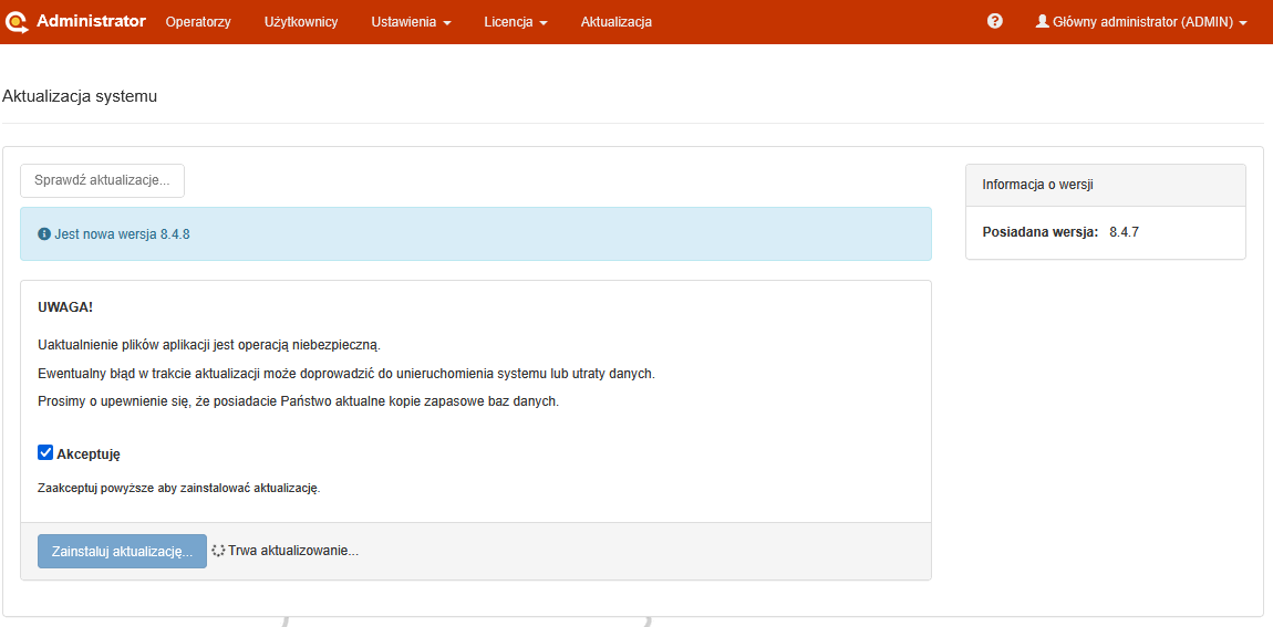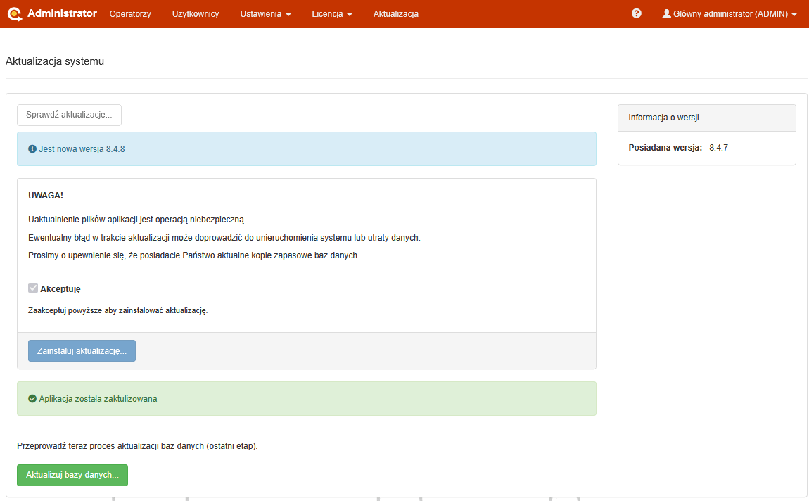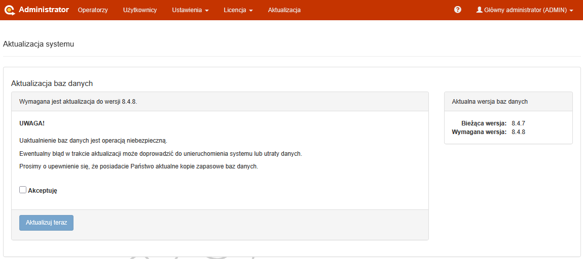 Po akceptacji komunikatu poprzez zaznaczenie checkboksa obok napisu "Akcepuję", uaktywni się przycisk "Aktualizuj teraz" i po jego kliknięciu zostanie wykonana aktualizacja baz danych.