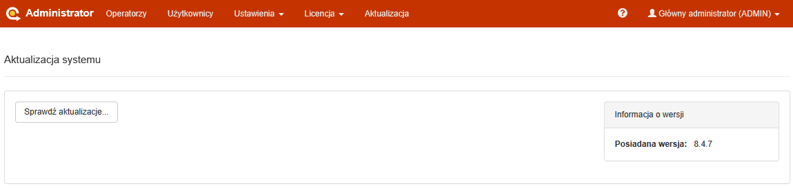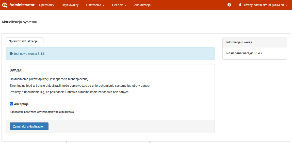 W module administratora dostępne jest również narzędzie do przeprowadzenia automatycznej aktualizacji systemu eKsięgowy. Pierwsze powiadomienie o nowej wersji wraz z krótkim opisem pojawia się w systemie eKsięgowy. Kiedy zostanie opublikowana nowa wersja, klient otrzymuje również powiadomienie na adres email podany podczas rejestracji systemu. W górnym menu dostępna jest zakładka " Aktualizacja ". Po wybraniu tej funkcji system podaje aktualną wersję naszego systemu eKsięgowy. Z lewej strony okna znajduje się przycisk do sprawdzenia czy nowa wersja została już opublikowana dla tej licencji.