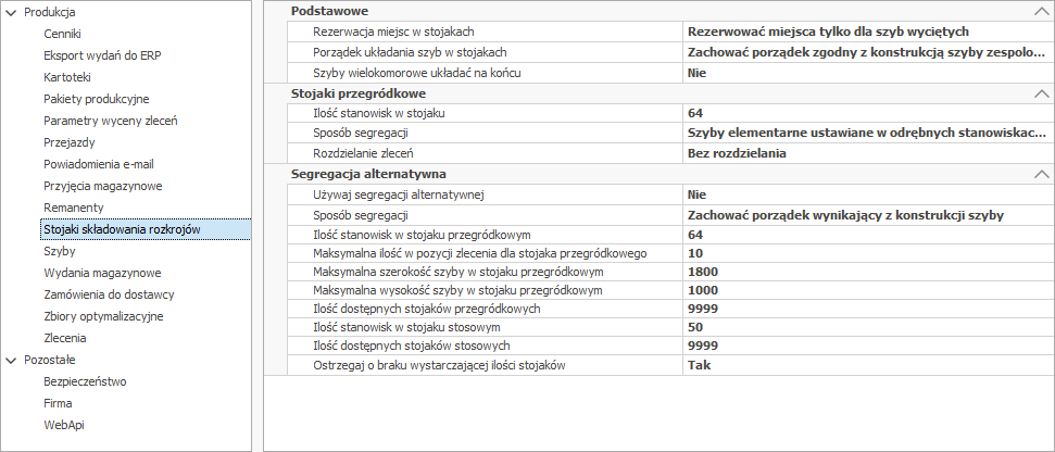 Uwaga! Jeżeli używana jest segregacja alternatywna (pierwsza opcja na TAK), to ustawienia górne (Podstawowe i stojaki przegródkowe) nie są brane pod uwagę. Ustawienia te nie łączą się ze sobą.