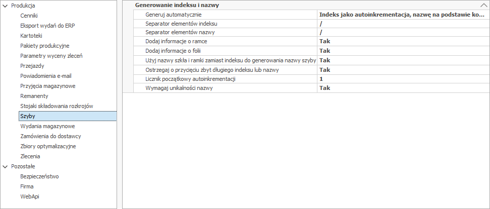Generowanie automatyczne pozwala na tworzenie indeksu i nazwy szyby automatycznie w zależności od wybranej opcji z listy rozwijanej. Do generowania używane będą podane niżej separatory.