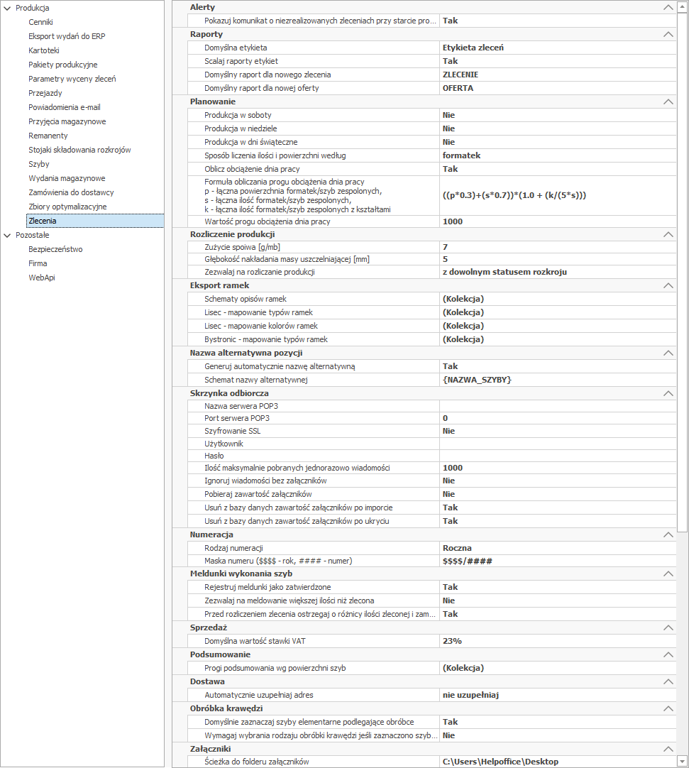 Pole "podsumowanie" zawiera wartości wykorzystywane do poprawnego wskazywania podsumowania szyb dla zleceń.