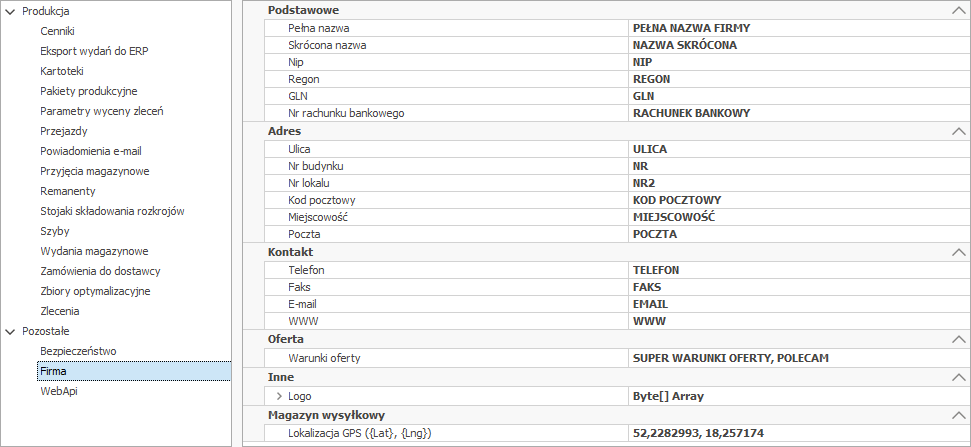 Wszystkie pola - Podstawowe, Adres i Kontakt - będą automatycznie uzupełniać pola adresowe naszej firmy w raportach.