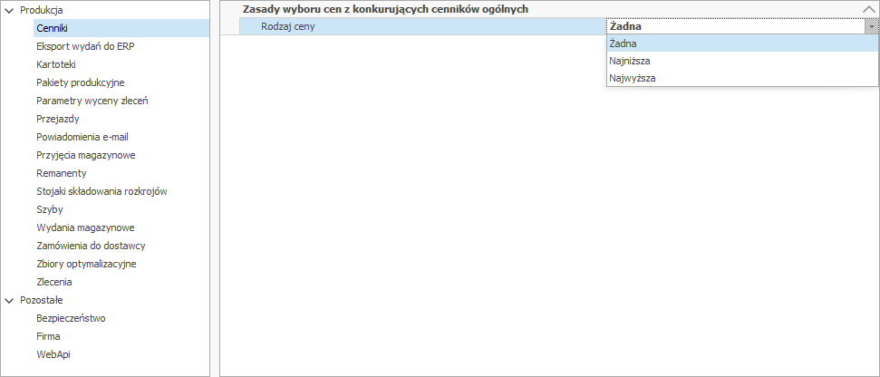 Rodzaj ceny wpływa na wybór cen produktów z konkurujących cenników ogólnych (stworzone dla wszystkich kontrahentów) podczas trzworzenia nowych zleceń.