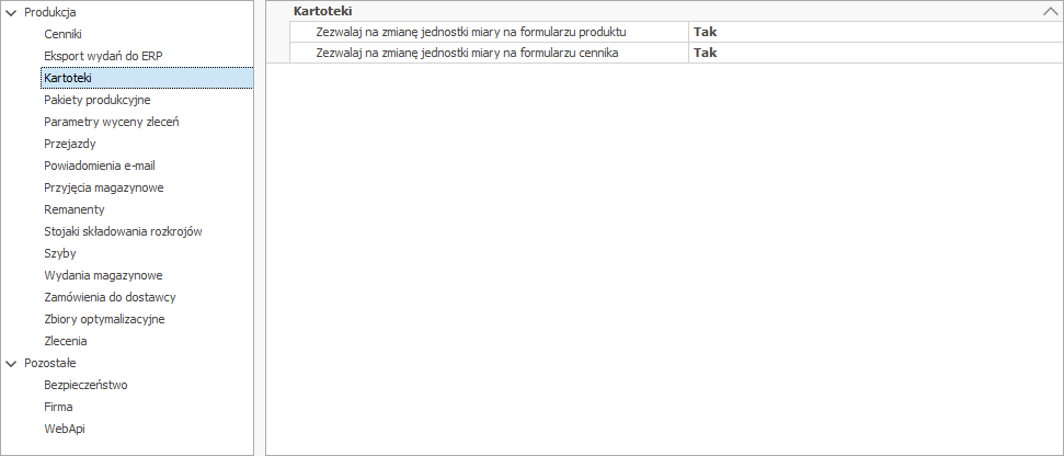 Ustawienia dla kartotek wpływają na edycję jednostek miar dla produktów i cenników.