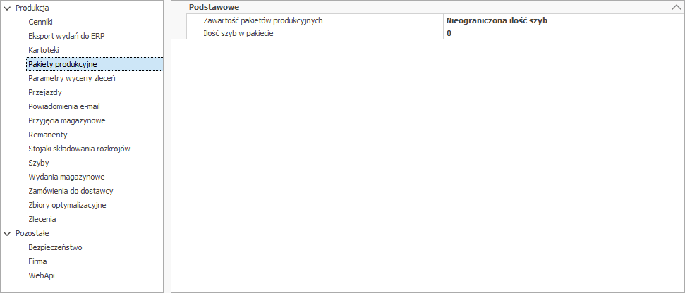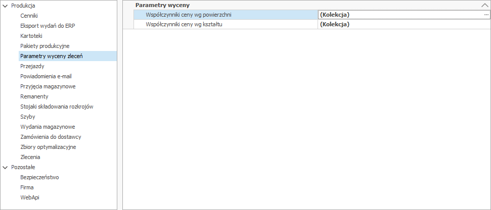Parametry wyceny wpływają na ostateczne wyliczenia kwot dla pozycji zleceń. Wyróżnione zostały wyceny wg powierzchni i wg kształtu szyb.