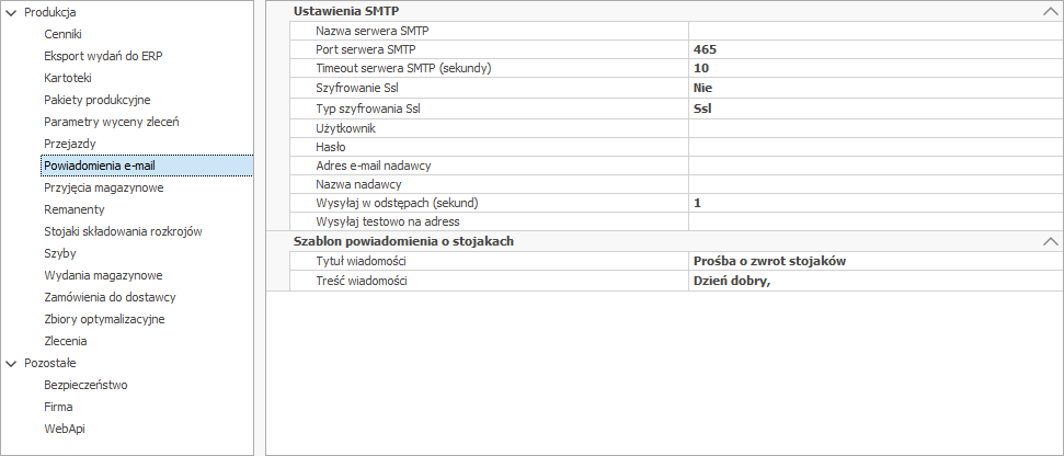 Po wpisaniu odpowiednich parametrów dla ustawień SMTP, będzie możliwe przesyłanie powiadomień o stojakach na e-mail kontrahenta. Adres e-mail kontrahenta musi być ustawiony z odpowiednim sufiksem [s].