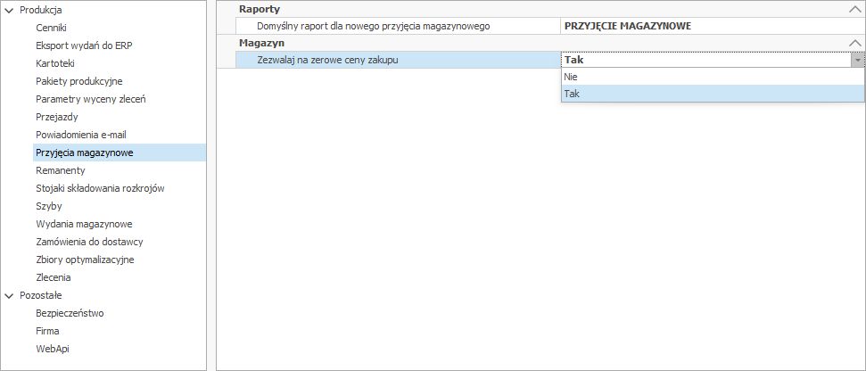 W przyjęciach magazynowych możemy zezwalać lub nie na zerowe ceny zakupu produktów.