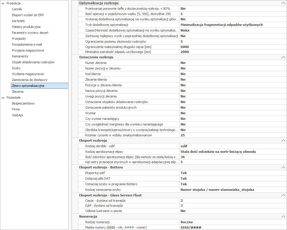 "Numeracja" określa w jaki sposób numerowane będą kolejno optymalizacje (rocznie lub ciągły), oraz jak wyświetlany ma być numer optymalizacji. Maskę numeru można określić na własny sposób poprawiając opis znakami $ i #.