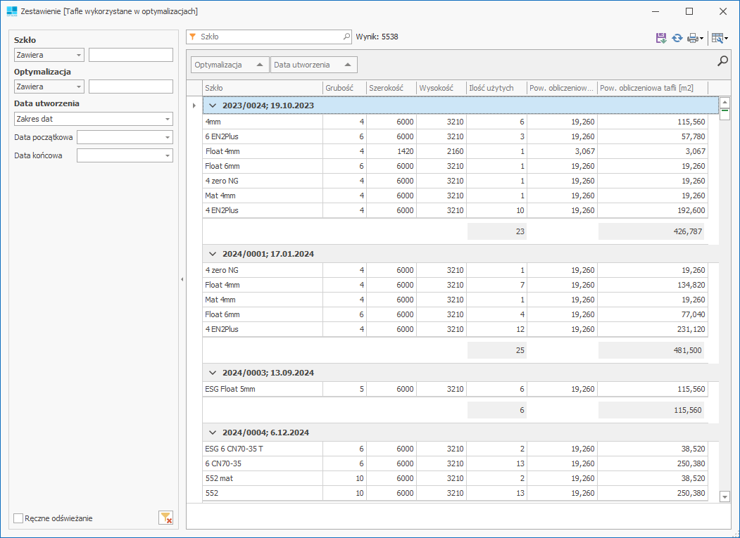 Zestawienie zlicza ilości i powierzchnie taflii szkła wykorzystanych w danych optymalizacjach.
