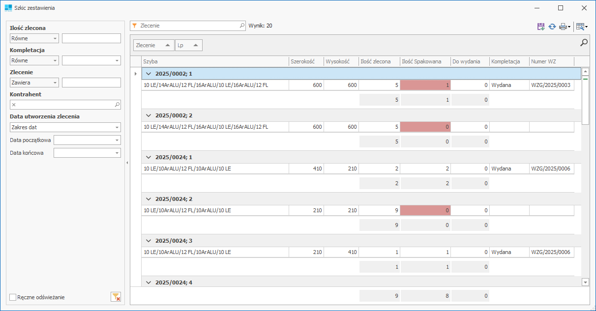 Czerwony – w polu "Ilość Spakowana" to różnica między liczbą spakowanych a zleconych formatek.