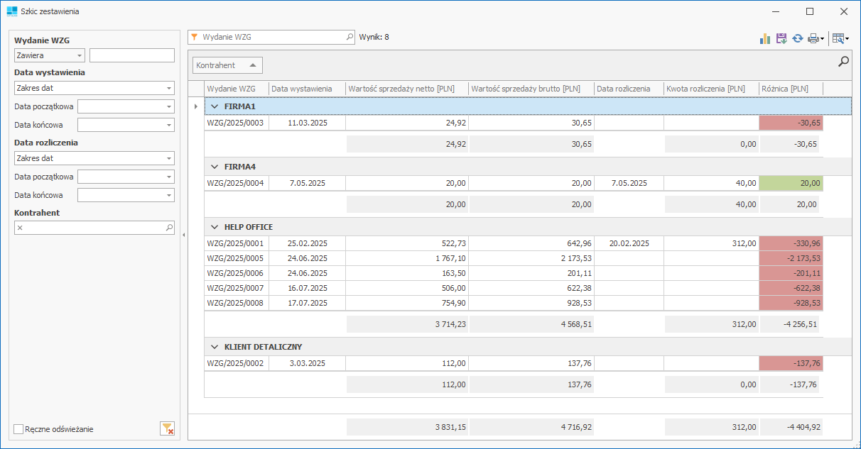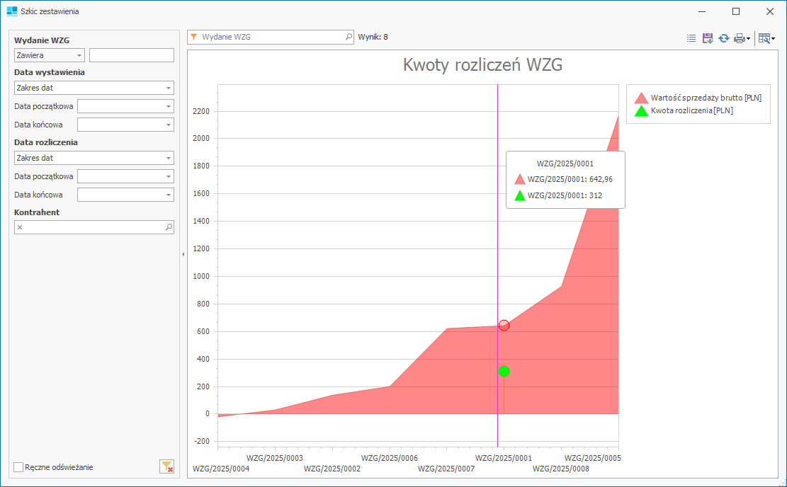Zestawienie przedstawia wartości rozliczeń wszystkich dokumentów WZG.