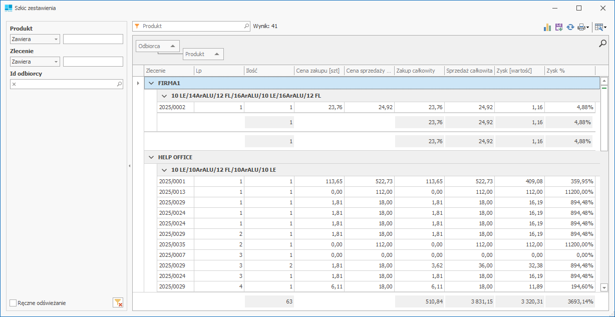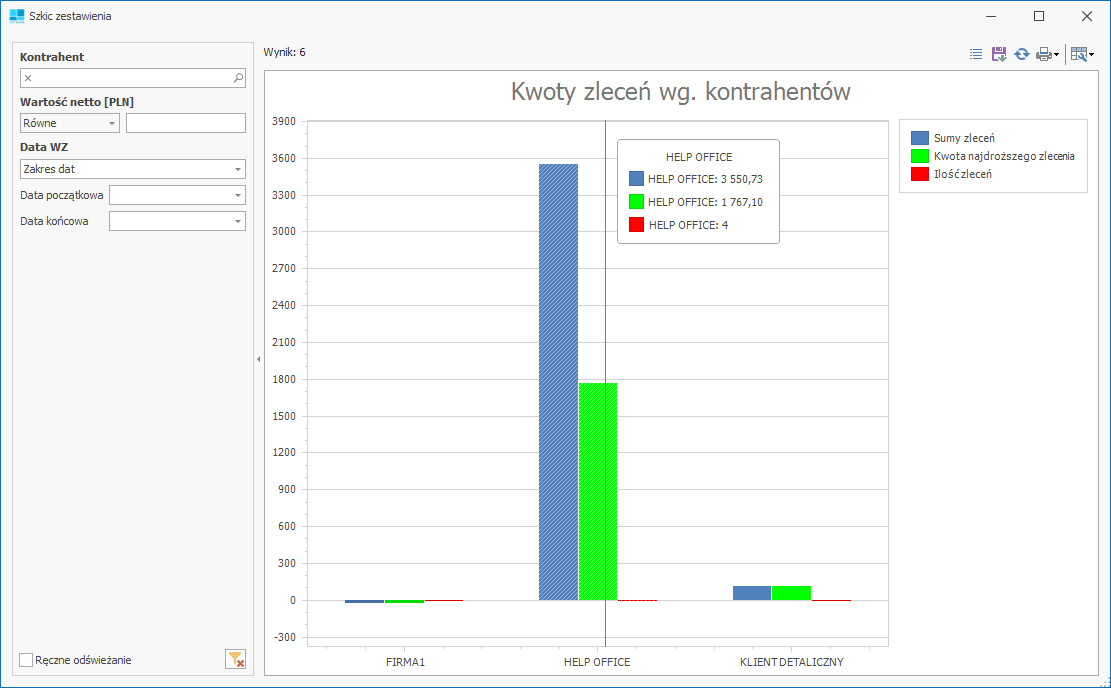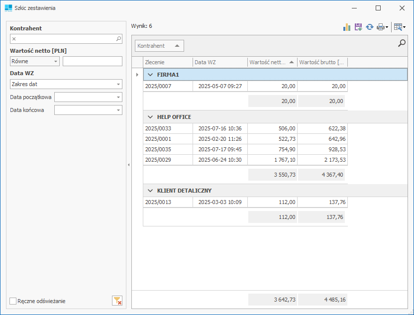 Zestawienie przedstawia wartości wszystkich zleceń pogrupowanych według kontrahentów.