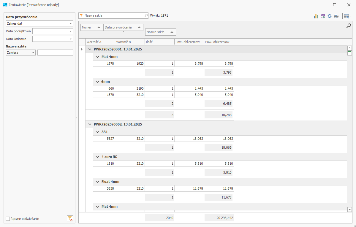 Zestawienie zlicza ilości i powierzchnie odpadów, które zostały przywrócone na magazyn do ponownego użycia.
