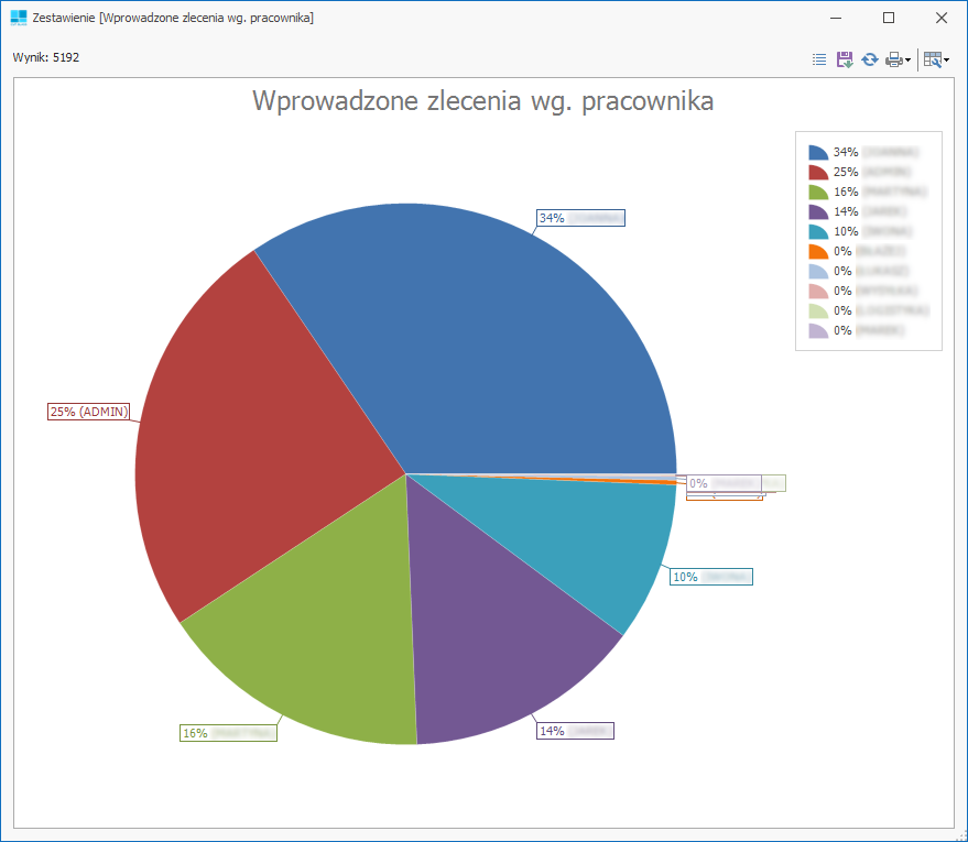Zestawienie pokazuje ilości zleceń i procent zaangażowania pracownika przy wprowadzaniu zleceń.