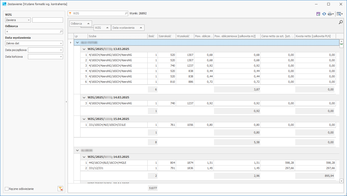 Zestawienie przedstawia ilości, powierzchnie i kwoty wydanych formatek, posegregowanych według odbiorcy.