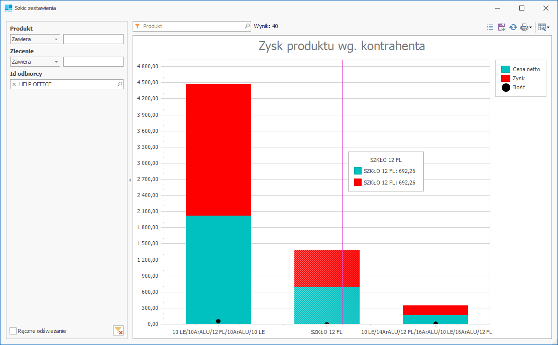 Zestawienie pokazuje zysk na wybranym produkcie. Kluczowe wartości znajdują się w podsumowaniach (szare pola).