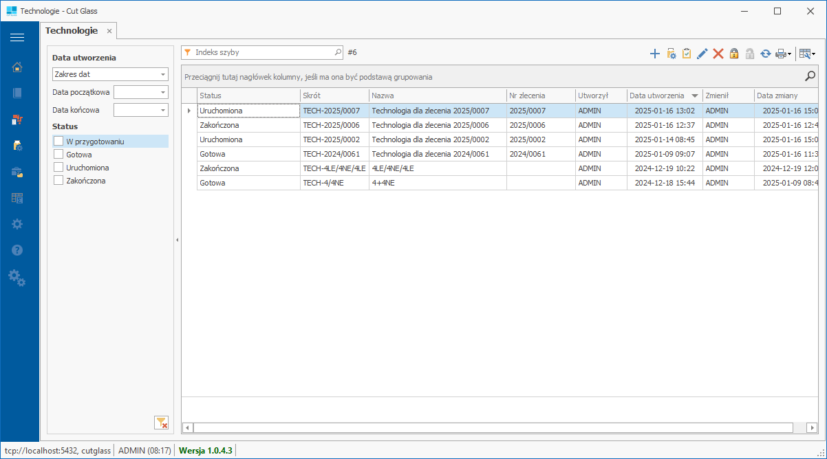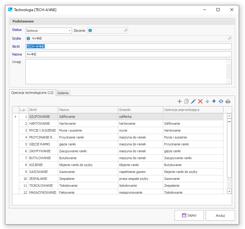 Każda technologia musi mieć przypisaną szybę, która później będzie odpowiadać wszystkim pozycjom zlecenia z tą właśnie szybą.