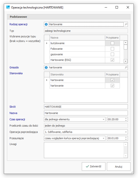 Operacja technologiczna składa się z rodzaju operacji, gniazda, stanowiska, czasu operacji, operację poprzedzającą oraz przesunięcie w czasie.
