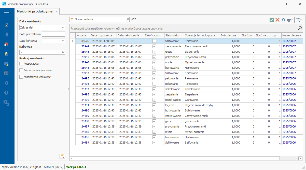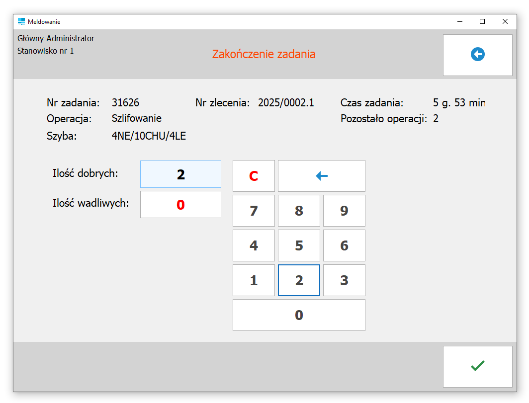Meldując wykonanie zadania operator podaje ilość wykonanych szyb dla zlecenia. Meldunek może być zakończony całkowicie lub częściowo.