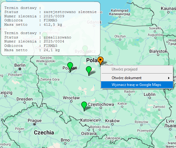 Wybierając punkty na mapie i używając prawego przycisku myszy program pozwoli nam na utworzenie trasy dla tych punktów. Tak wyznaczoną trasę można później udostępnić bezpośrednio do kierowcy.