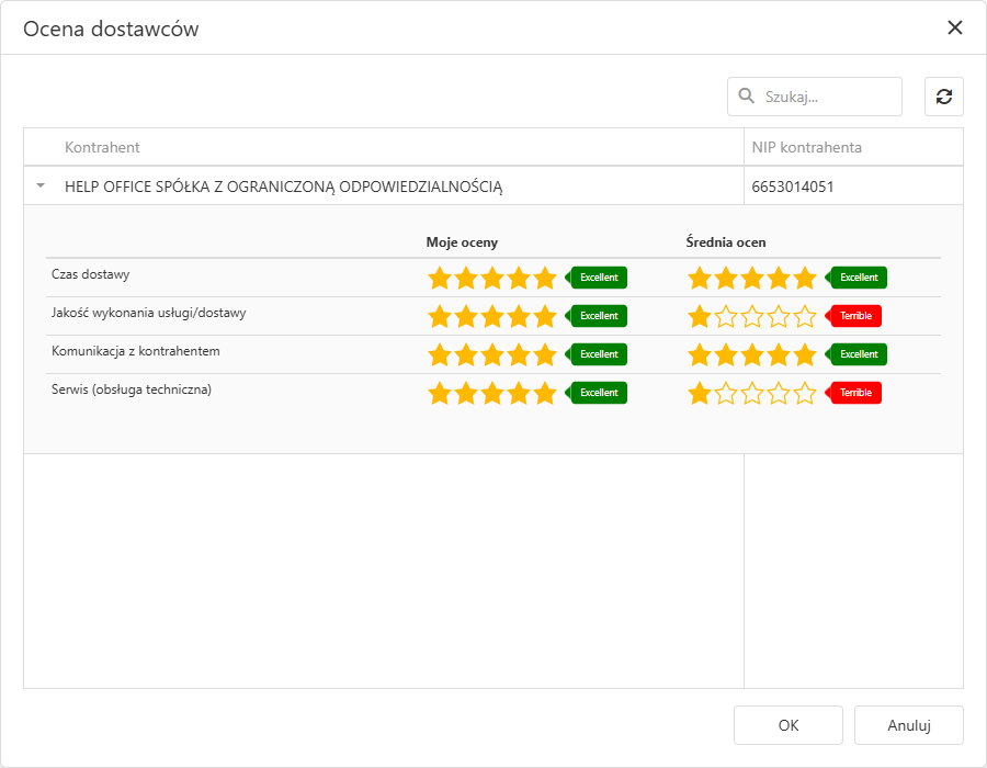 ocena - umożliwia ocenę danego kontrahenta, którego dotyczy dany wniosek
