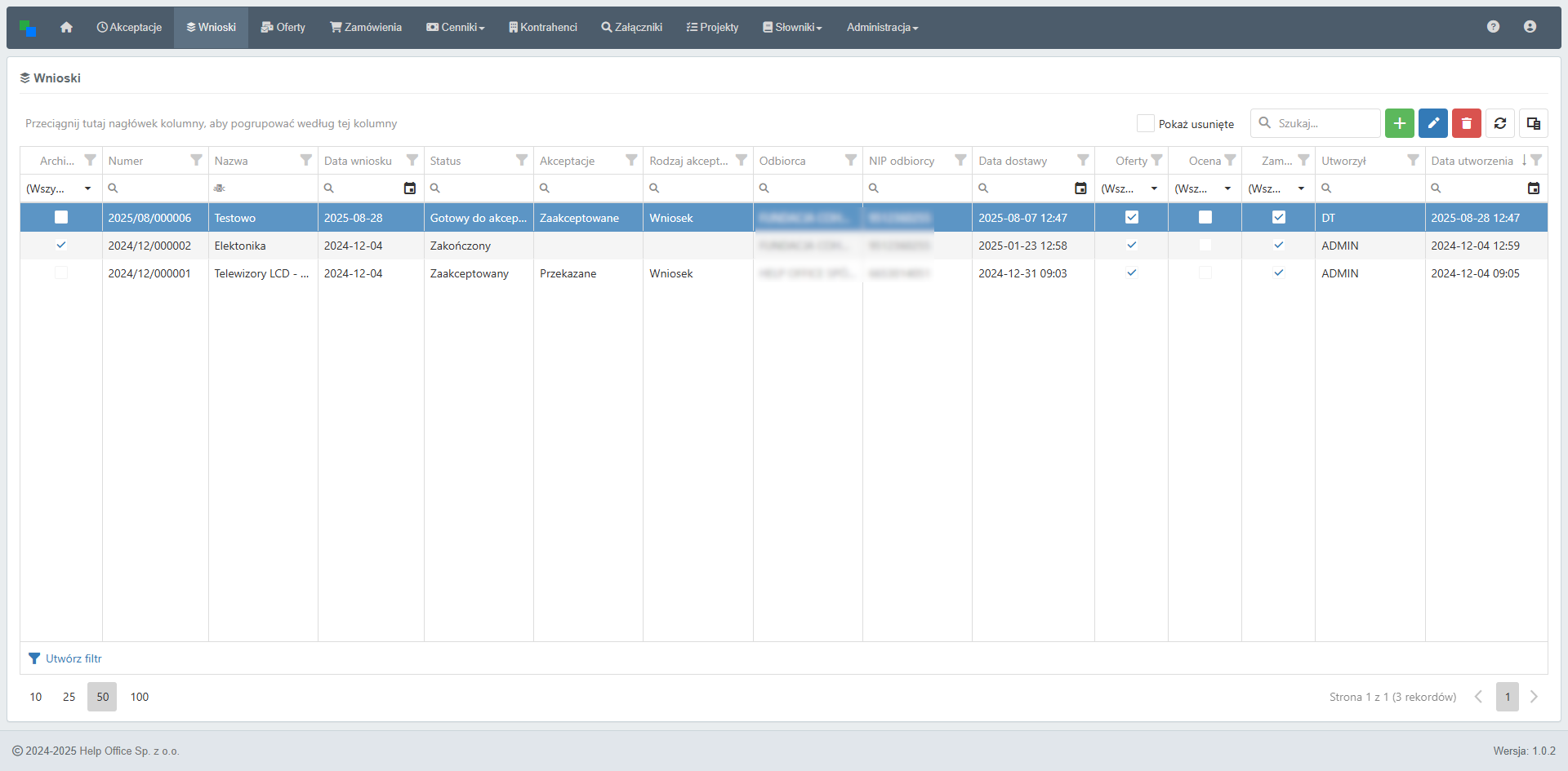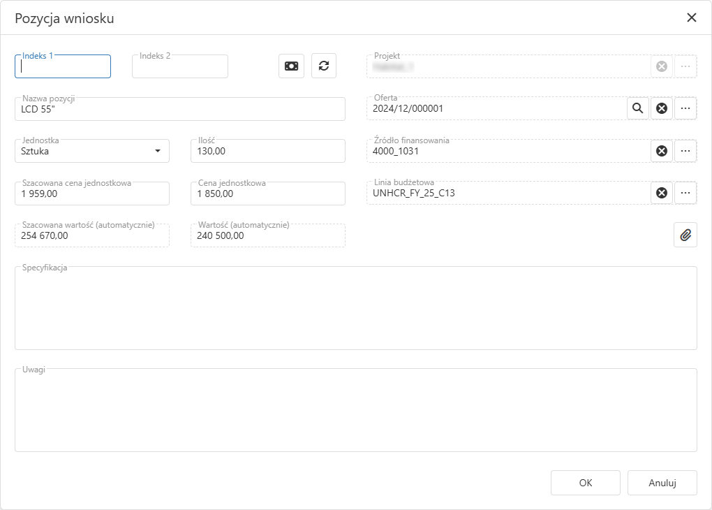 Do wniosku dodawane są pozycje zakupowe, które wskazane były w danej ofercie.