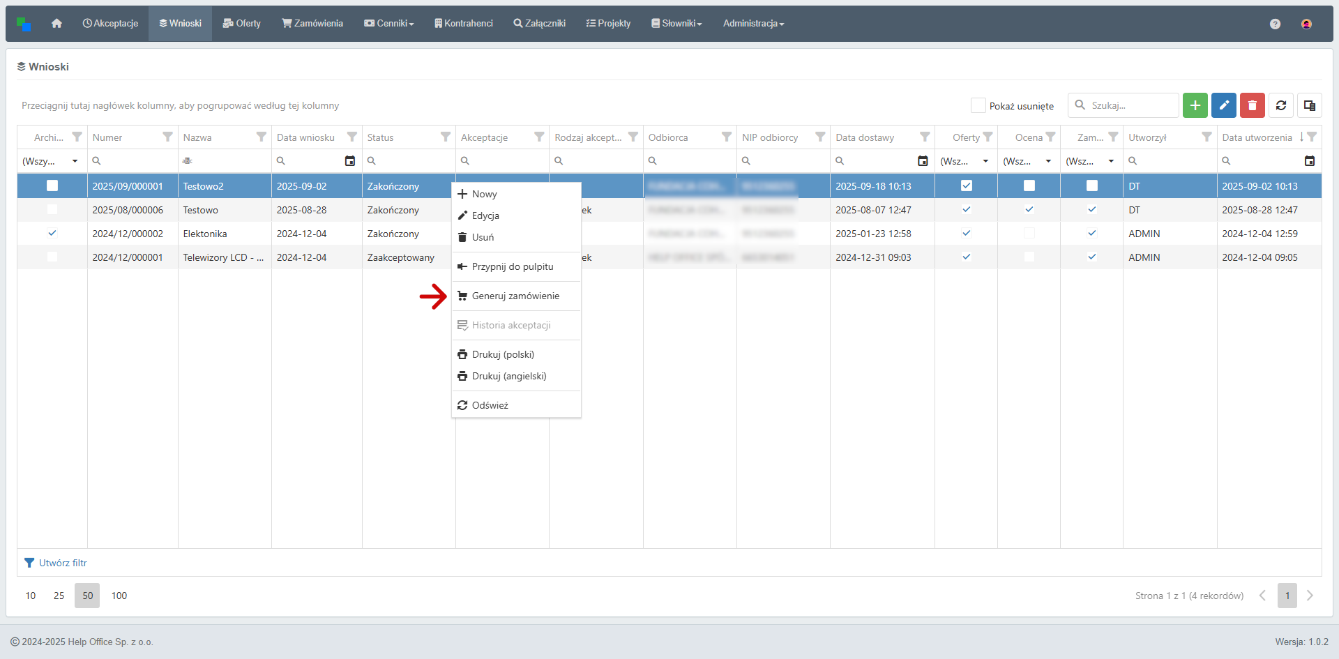 Jeżeli wniosek spełnia powyższe wymagania, to na takim wniosku trzeba kliknąć prawy przycisk myszy i wybrać opcję "generuj zamówienie".