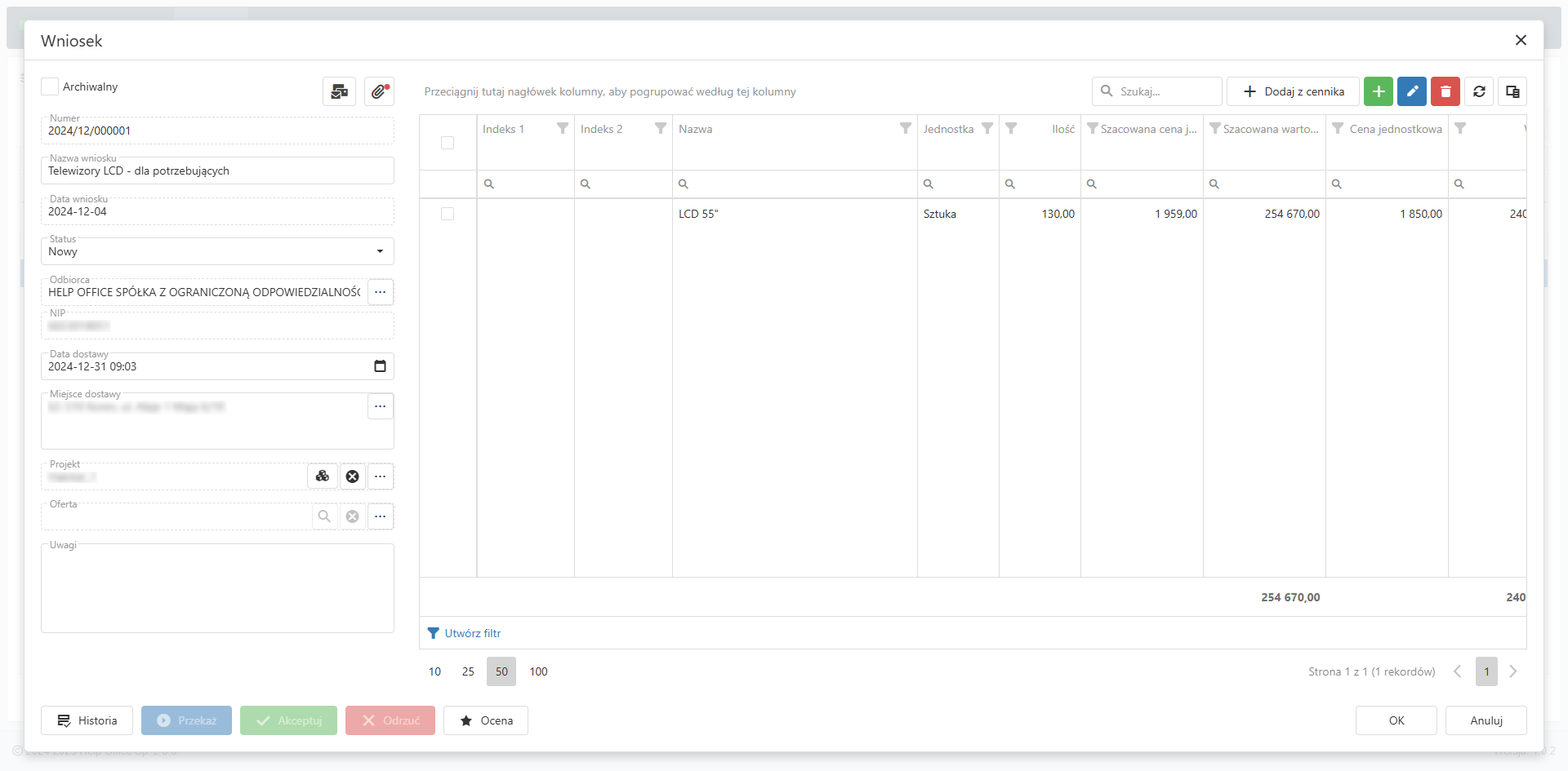 Dodatkowo, dla każdej pozycji wniosku można automatycznie zaktualizować jego dane z cennika (np. w przypadku, gdy zostanie zaakceptowany nowy cennik).