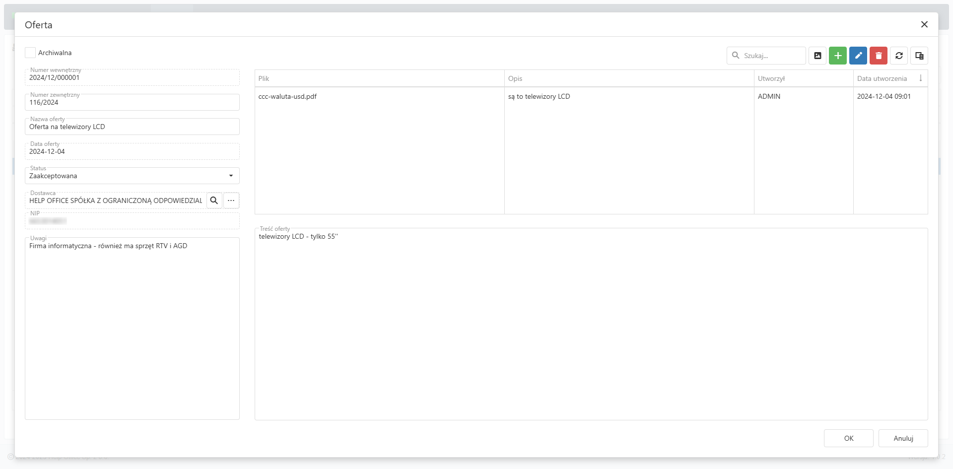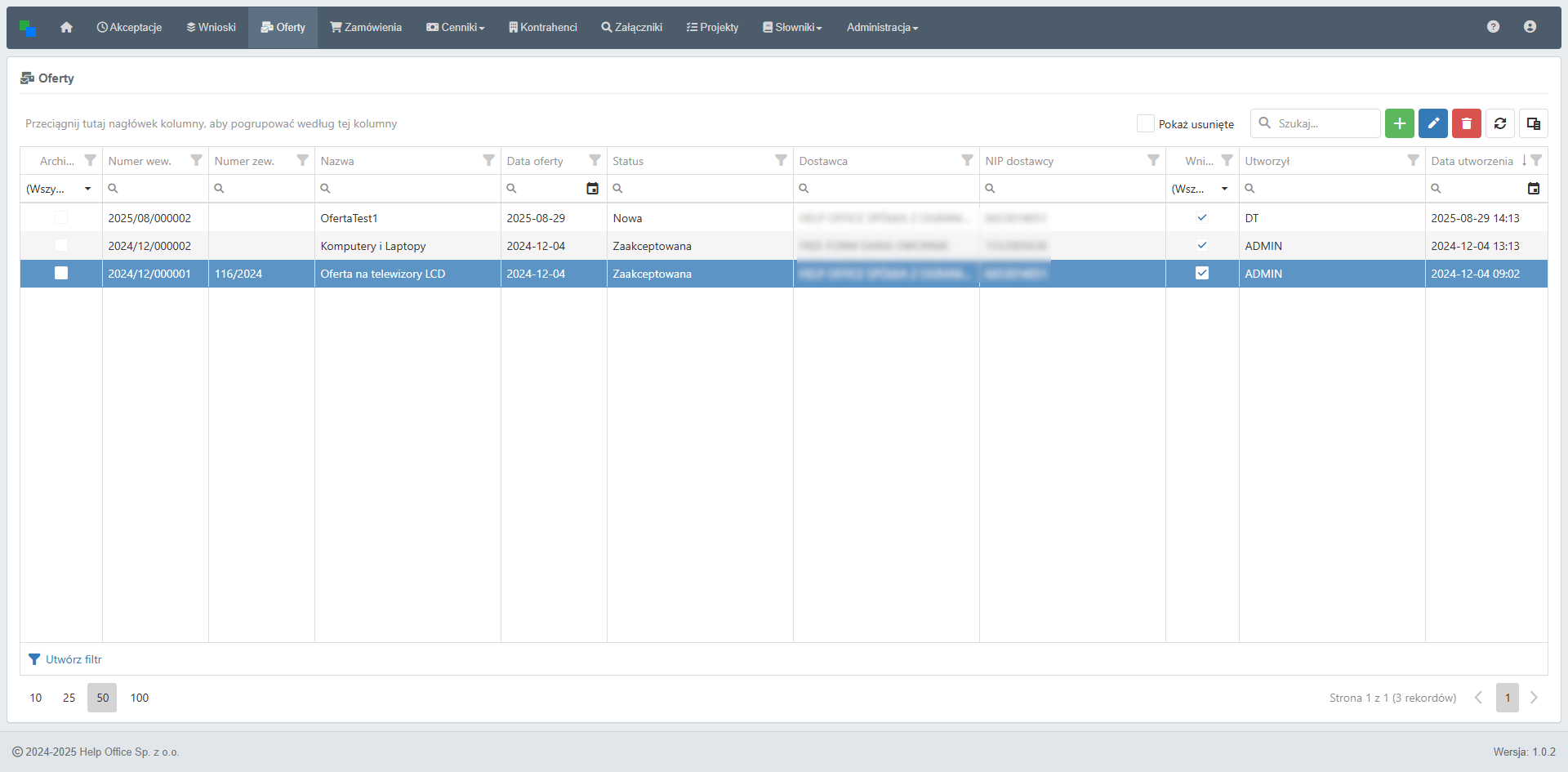 Dla każdej nowej oferty wymagane jest dodanie jej nazwy, oraz odpowiedniego dostawcy.