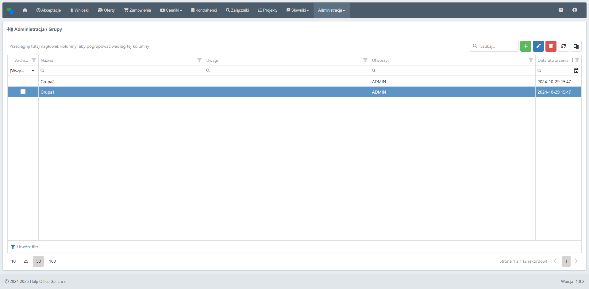 Pełna lista grup, w których można posegregować wybranych użytkowników.Grupy użytkowników są ważne podczas akceptacji wniosków.