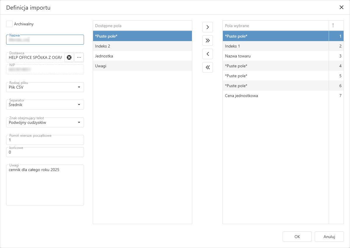 Mapowanie pól z importowanego odbywa się przez przenoszenie pozycji z listy "Dostępne pola" (pola eOferoZam) na listę "Pola wybrane". Lista "Pola wybrane" powinna zawierać ilość pozycji odpowiadającą ilości pól w importowanym pliku. Jeśli pole z importowanego pliku ma zostać pominięte podczas importu to należy w jego miejsce wprowadzić pozycję "*Puste pole*".