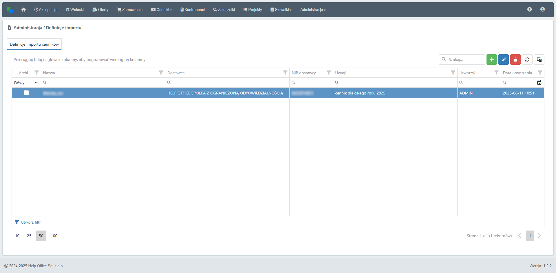 Lista definicji importów zewnętrznych dokumentów. Definicje importu biorą udział podczas importu cenników.