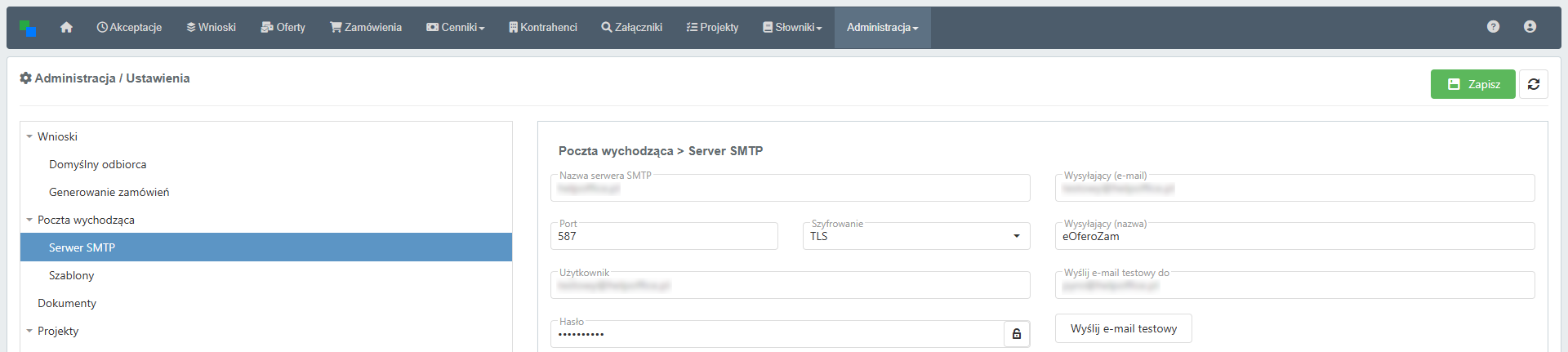 Tutaj podaje się wszystkie dane do konta e-mail, dzięki którym system automatycznie prześle powiadomienia o dokumentach oczekujących na akceptację.
