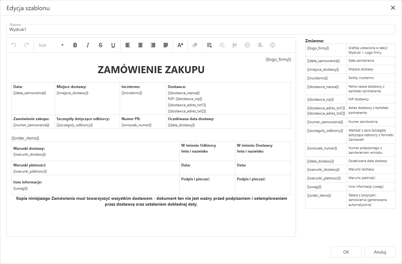 Pole "zmienne" określa wszystkie dostępne zmienne, które można użyć podczas edycji szablonu dokumentu.