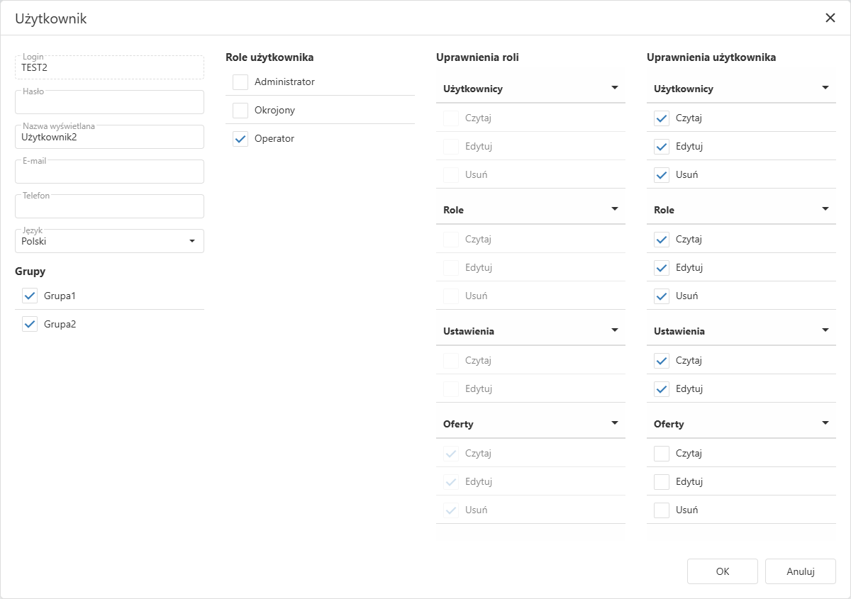 Użytkownikowi można nadać dodatkowe uprawnienia, które nie były uwzględnione dla jego roli.