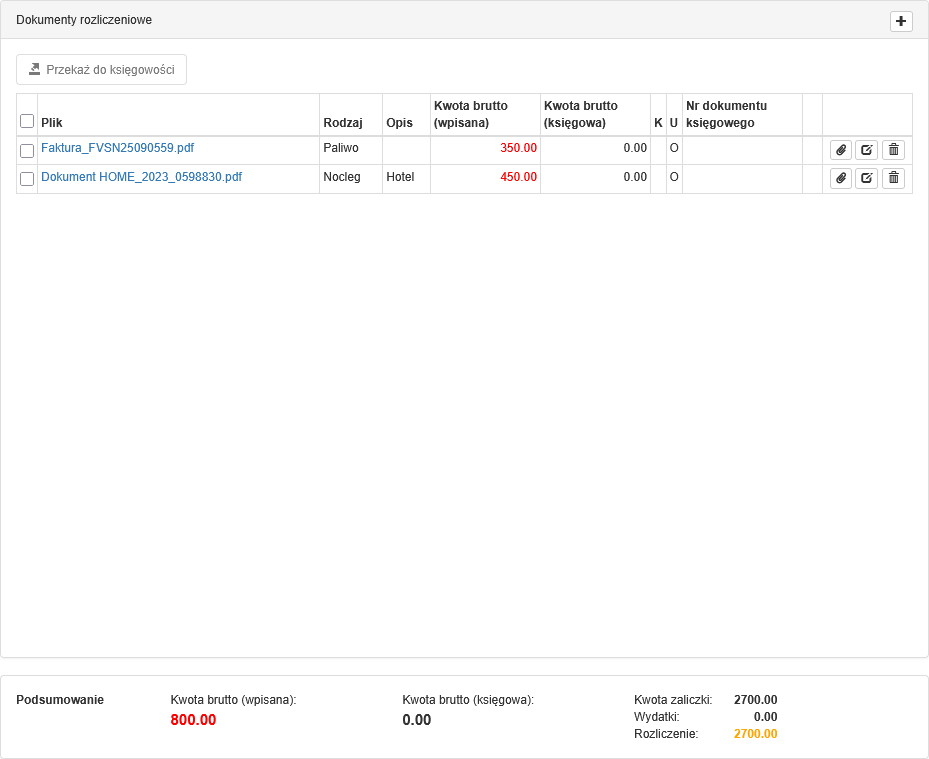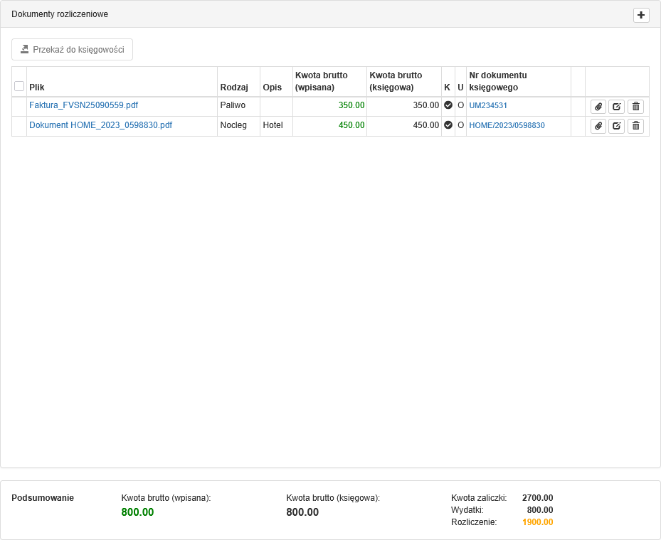 Po przetworzeniu dokumentów przez księgowość, system prezentuje wpisaną kwotę z dokumentów z kwota księgową dokumentu wpisaną przez księgowość.