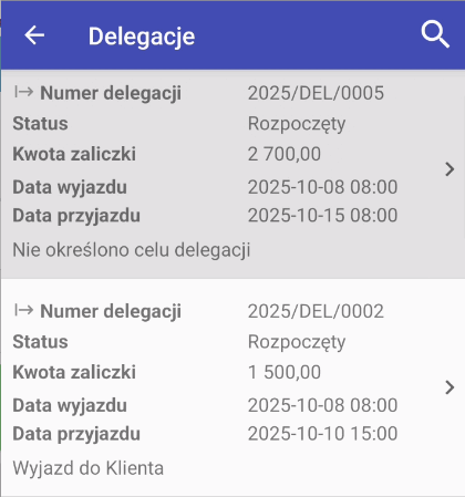 Po kliknięciu w odpowiednią kategorię można zobaczyć podsumowanie delegacji z odpowiednim statusem