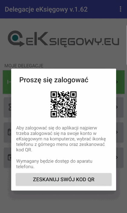 Po uruchomieniu aplikacji mobilnej, aby się zalogować należy zeskanować kod QR który jest wyświetlany po zalogowaniu się w przeglądarce przez pracownika.