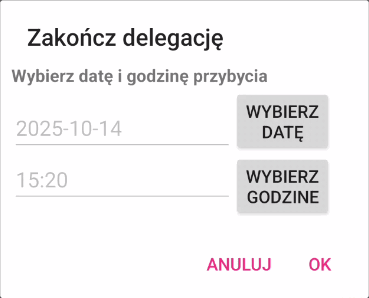 Przy kończeniu delegacji należy uzupełnić datę i godzinę zakończenia delegacji.